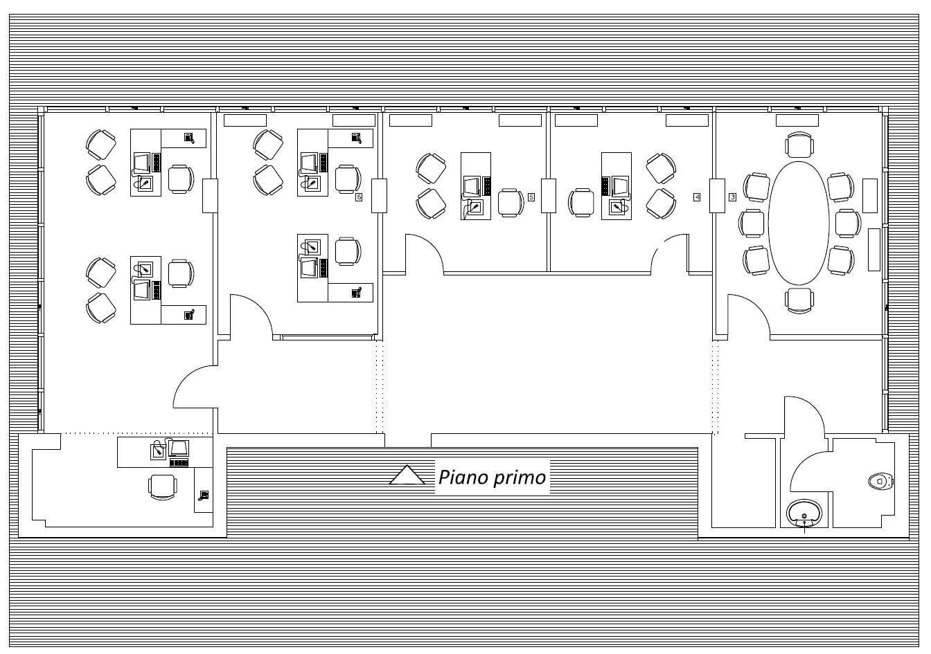Il progetto Isec riguarda una società sede di uffici commerciali, con una zona ricezione in posizione centrale in prossimità dell’ingresso, e due zone laterali alle quali sono connessi da una parte alcuni uffici e dall’altra l’ufficio / sala riunioni e la zona servizi e ripostiglio.