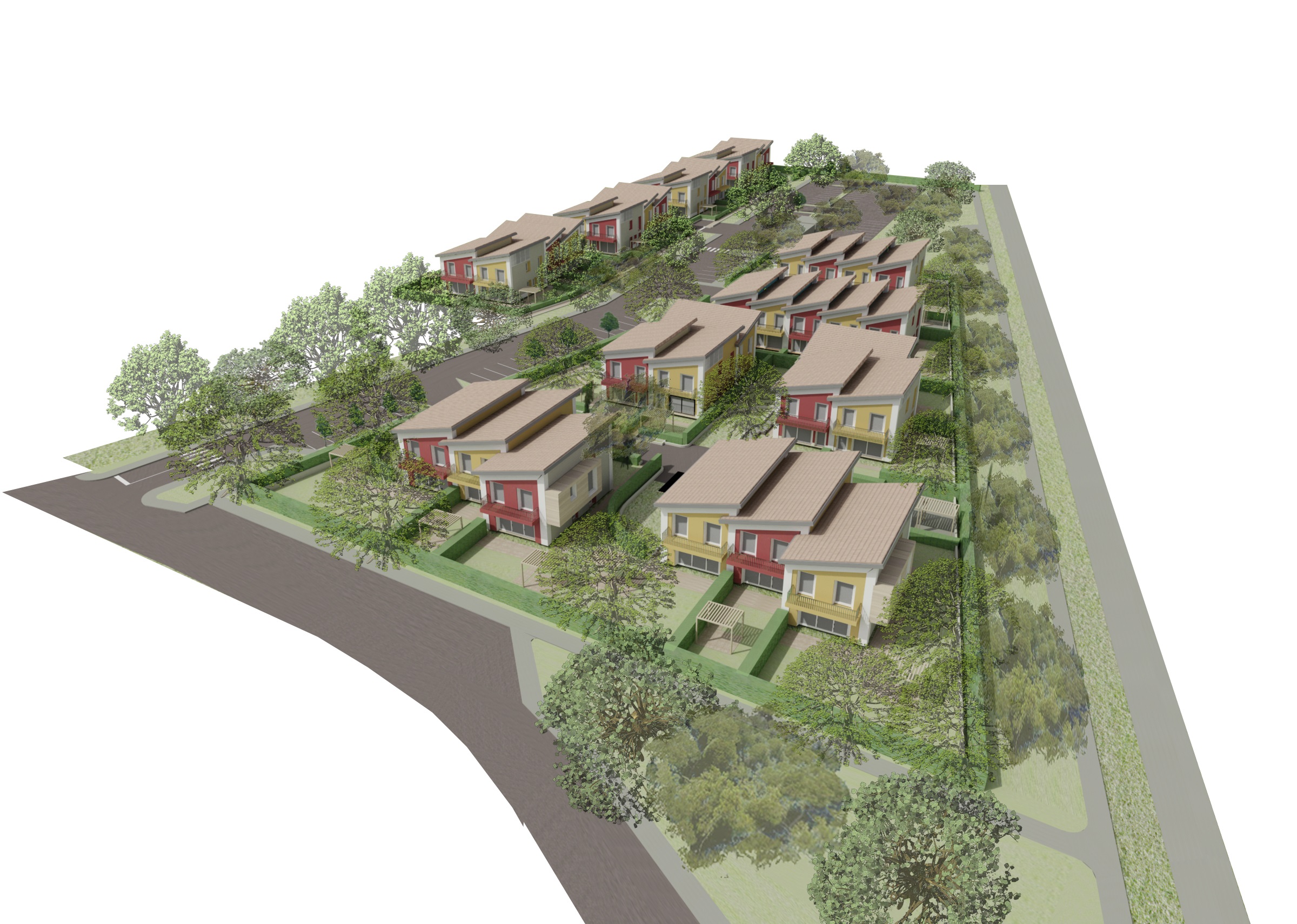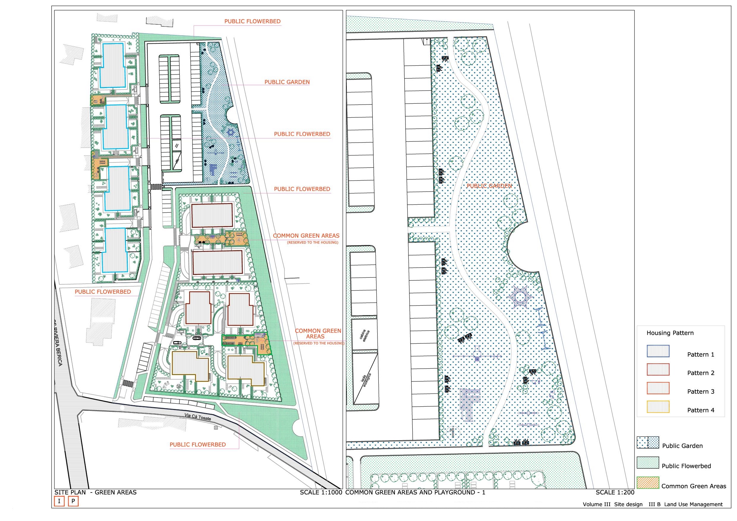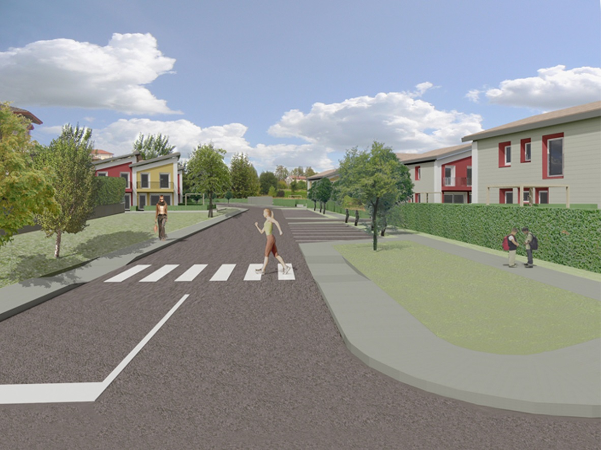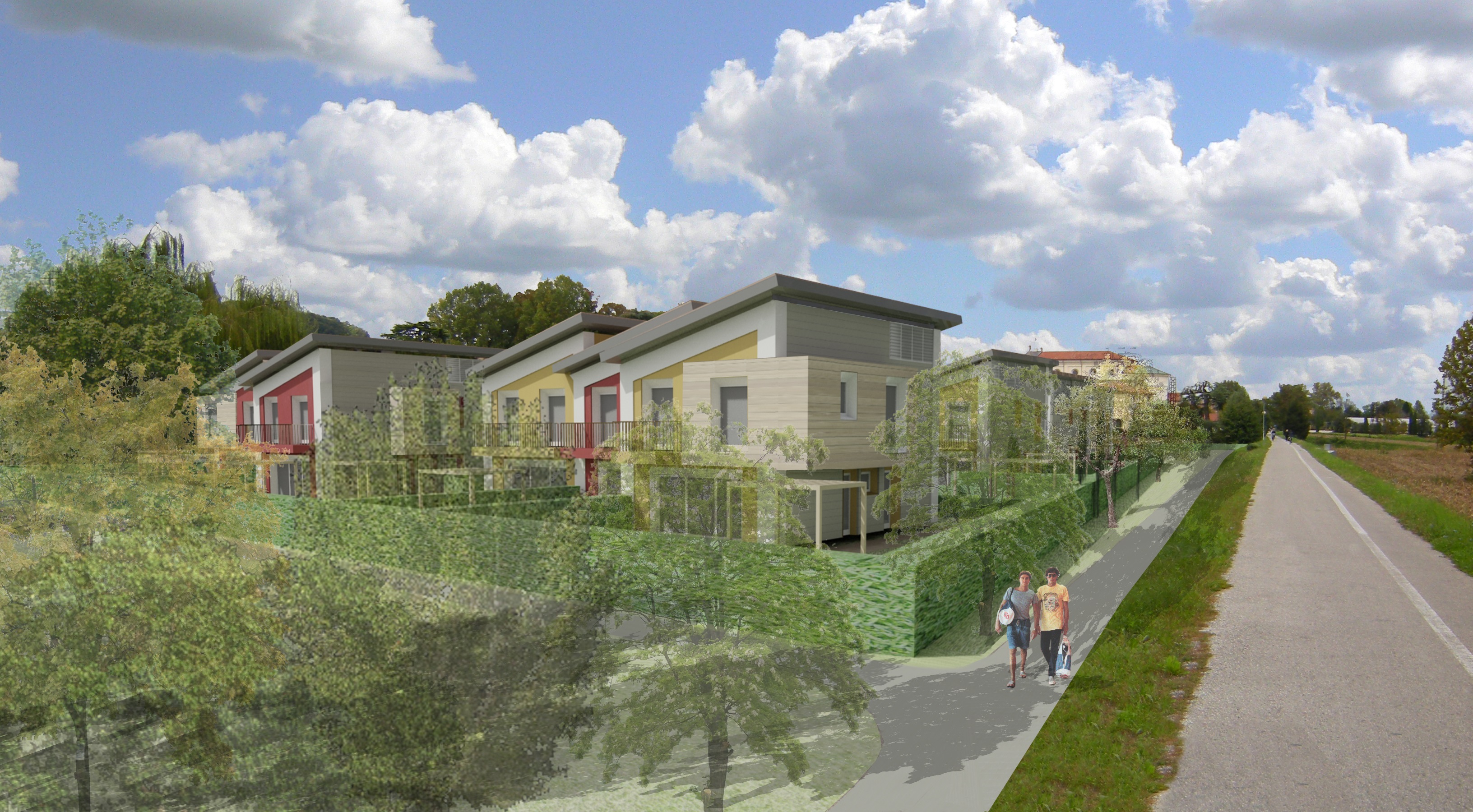 Progetto preliminare di concorso per area PAC 1 a Campedello, Vicenza. Complesso residenziale diviso in comparti che si distingue per le aree verdi interne ai vari nuclei residenziali, strutturati con zone comuni per il relax e con servizi collettivi per cucinare e mangiare insieme e per vivere attivamente gli spazi comuni.